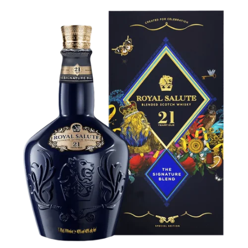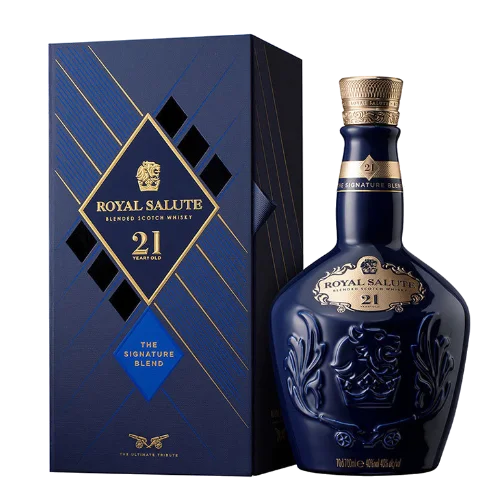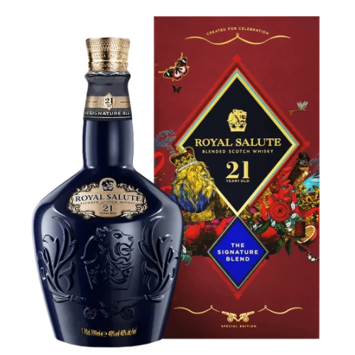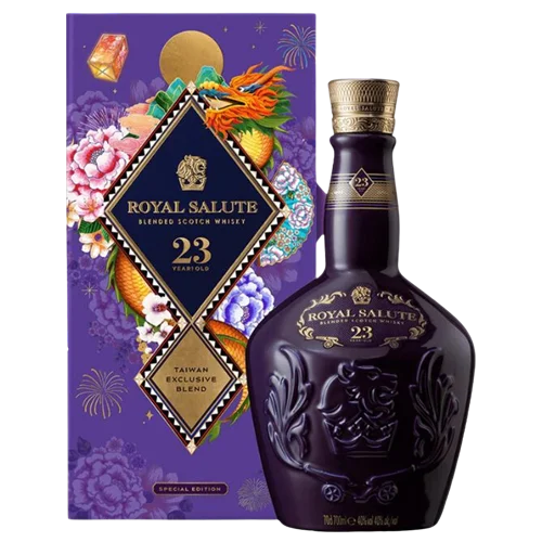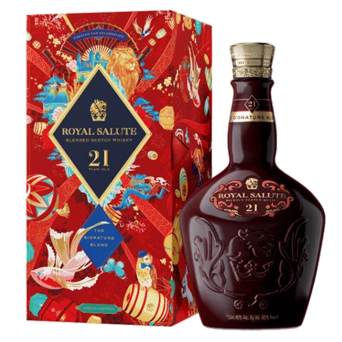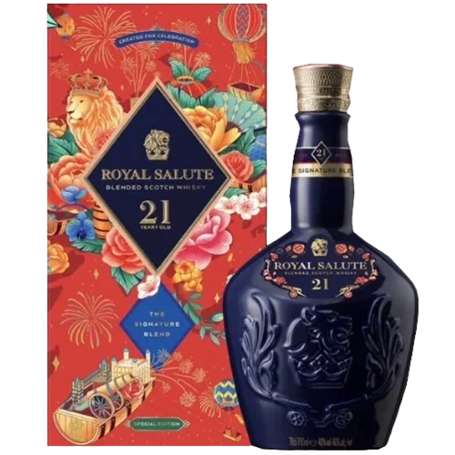 皇家禮炮 21 年鴻運雙龍限定版為品牌迎接農曆新年而推出的限定款,以至少21年熟成的調和蘇格蘭威士忌為基礎,結合中式「雙龍」吉祥意象及節慶設計,具送禮與收藏雙重價值。酒款延續 Royal Salute 經典熟成風格,融合熟梨、柑橘、香草與橡木香氣,搭配限定包裝與圖騰,使其在華人市場中具高度辨識度與稀缺性。