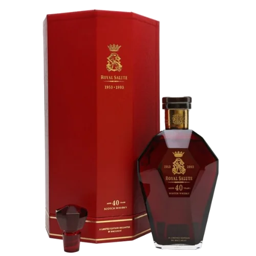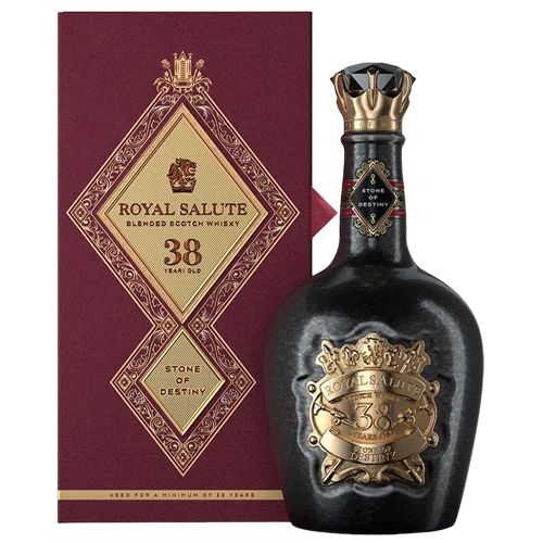(Royal Salute 38 Year Old Stone of Destiny) 是品牌專為皇家與蘇格蘭傳承打造的頂級調和威士忌版本,酒液至少陳年 38 年,酒體融合深沉雪莉橡木、乾果與香料層次。此款象徵「命運之石」— 蘇格蘭王室加冕所用的歷史寶石,瓶身與包裝皆具典藏感,為藏酒者夢寐以求的高端款。
