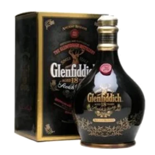 格蘭菲迪 18 年黑瓷瓶(Glenfiddich 18 Years Old Black Ceramic Decanter)來自蘇格蘭 Speyside 產區,是由 Glenfiddich 酒廠於 18 年陳年段推出的特別瓶款。此款裝瓶於黑色陶瓷瓶(或黑瓷裝)設計,相較標準 18 年款更具設計與收藏感。酒體以雪莉桶與橡木桶混熟展現成熟果乾、烤堅果、深橡木與桃李風味,結構豐潤、餘韻悠長。此版本因包裝特色稀有性,收藏價值亦較一般款高。