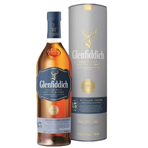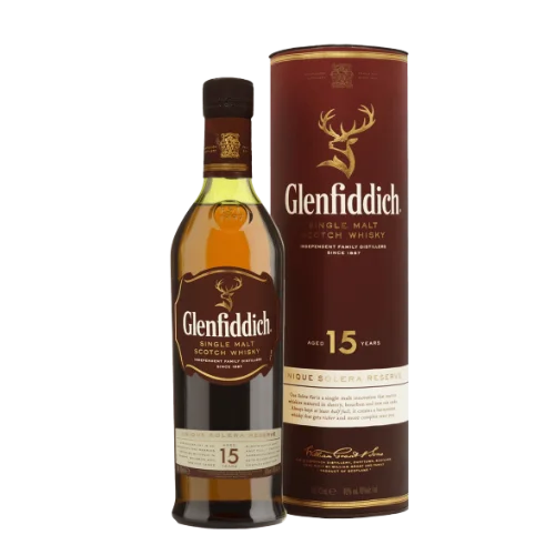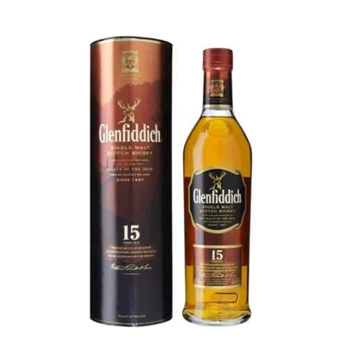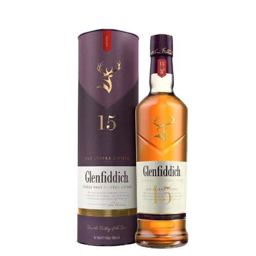 格蘭菲迪 15 年單一麥芽威士忌(The Glenfiddich 15 Year Old)來自蘇格蘭 Speyside 產區,採用雪莉桶、波本桶及新橡木桶熟成,再通過「Solera Vat/太陽桶系統」融合調配,成就其暖香料、蜂蜜、水果乾的風味結構。