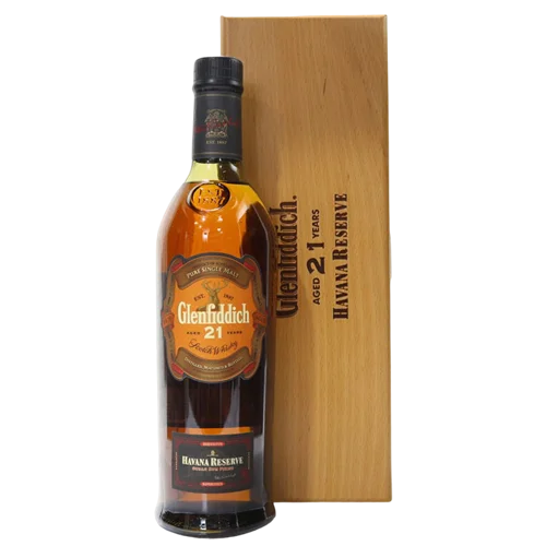格蘭菲迪 21 年 Havana Reserve(The Glenfiddich 21 Years Old Havana Reserve)來自蘇格蘭 Speyside 產區,以其獨特的「朗姆桶潤桶(Rum Cask Finish)」工藝著稱。酒體經 21 年熟成後,再轉入曾裝古巴朗姆酒的橡木桶中完成,帶出焦糖、熟香蕉、杏仁與香草層次,餘韻悠長且風格獨樹一格。此款在高端單一麥芽市場備受推崇。