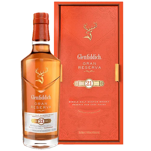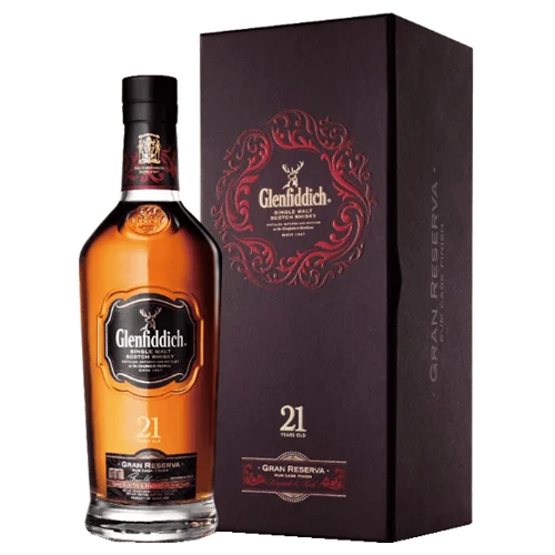格蘭菲迪 21 年單一麥芽威士忌(Glenfiddich 21 Years Old Single Malt Scotch Whisky)為 Speyside 產區頂級代表作之一。酒液於橡木桶熟成 21 年後,再轉入加勒比朗姆桶(Caribbean Rum Cask)進行潤桶熟成,賦予熱帶水果、太妃糖、香蕉與無花果等複雜層次風味,酒精濃度 40%。官方命名為「Gran Reserva」,具備極佳的香氣平衡與悠長尾韻,是品牌高階作品中最受歡迎的常態款之一。