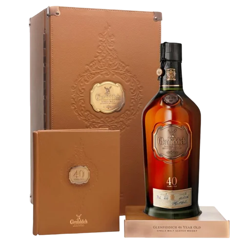 格蘭菲迪 40 年單一麥芽威士忌(Glenfiddich 40 Year Old)出自蘇格蘭 Speyside 產區,是品牌陳年系列中的頂尖款。由首席釀酒師精選全球極少數超長熟成原酒,再經典桶型熟成四十載,使酒體展現層層堆疊的深度:乾果、黑巧克力、烘焙咖啡、燉蘋果、輕煙與橡木香交織。其色澤為深桃紅木質色澤(Dark Mahogany)或深栗色,入口滑順而豐富,餘韻悠長。每年全球限量釋出不到1000瓶。
