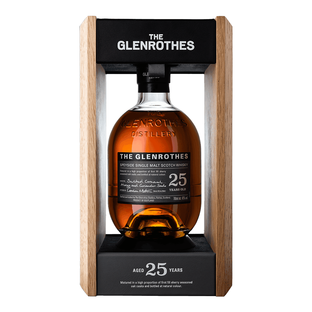 格蘭路思25年為品牌旗下最高年份的核心常態酒款之一,由 Berry Bros. & Rudd 接手後以旗艦地位重磅推出。全程熟成於精選首填雪莉桶中,展現極致的果乾、堅果、太妃糖與辛香料層次,搭配柔和口感與悠長尾韻,體現 Glenrothes 以年份為本的釀酒哲學與雪莉桶熟成藝術的巔峰表現。