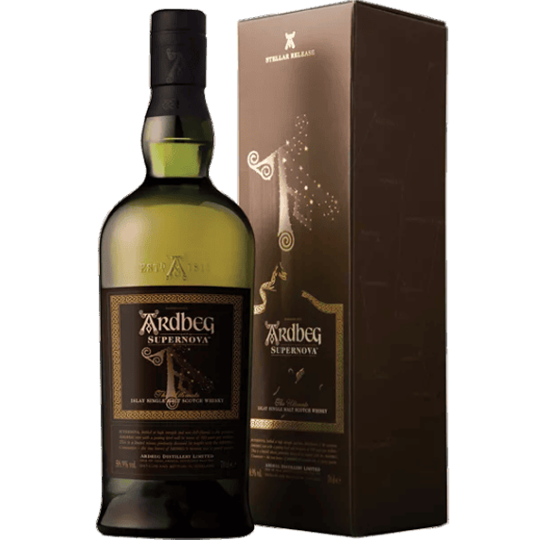 Ardbeg Supernova(超新星)系列於2009年首次推出,以極高泥煤含量(PPM)著稱,是品牌有史以來最強烈的泥煤風格實驗。此系列源自LVMH收購後對風味極限的探索,象徵Ardbeg在煙燻領域的創新突破。Supernova結合太空主題與實驗精神,每一版釋出皆引起市場轟動,成為重度泥煤愛好者的經典收藏。