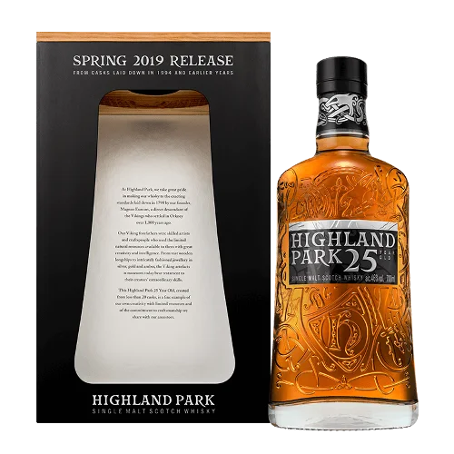 高原騎士25年新版Highland Park 25 years single malt Scotch Whisky為蘇格蘭Orkney島酒廠近年推出的新包裝版本,延續其高年份雪莉桶熟成風格,並在外觀設計上展現現代感與品牌識別度。此款威士忌融合濃郁果乾、橡木香料、蜂蜜與輕盈泥煤煙燻風味,口感層次分明,酒體圓潤滑順。新版包裝在提升陳列美感的同時,亦維持優異品質表現,是現今威士忌市場上兼具品飲與收藏價值的高端選擇,亦為收購市場關注重點。
