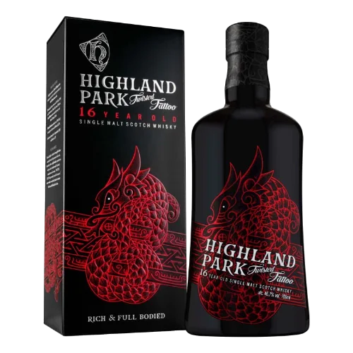 高原騎士 16年 TWISTED TATTOO Highland Park Twisted Tattoo 16YO Single Malt Scotch Whisky為蘇格蘭奧克尼群島Highland Park酒廠推出的特色16年單一麥芽威士忌,以北歐神話「Midgard Serpent塵世巨蟒」為靈感,並邀請丹麥紋身藝術家設計獨特瓶身包裝,象徵創意與傳統的深度交融。此款為酒廠首次採用西班牙Rioja葡萄酒桶與首次填充波本桶(first‑fill bourbon casks)共同熟成,帶出豐富的香草、蜜桃、夏季莓果及飽滿紅酒風味,同時融合石楠花泥煤煙燻底蘊,酒體層次複雜而平衡。因其創新工藝、限量定位與獨特文化象徵,高原騎士Twisted Tattoo 16年在高端威士忌市場與收購領域中備受矚目。