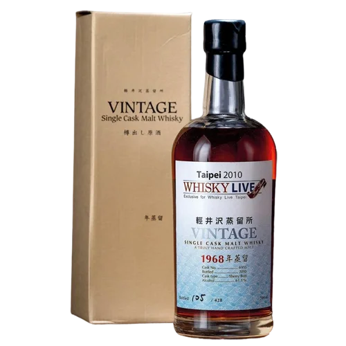 「輕井澤1968 Whisky Live Taipei 2010」為日本傳奇酒廠 Karuizawa 所推出的限量單桶威士忌。蒸餾於1968年、裝瓶年份2010年,酒精濃度為約61.1% ABV,桶號為 #6955,來自雪莉桶熟成,限量428瓶。此款為「Whisky Live Taipei 2010」會場限定版本,具備極高收藏價值與稀缺性。